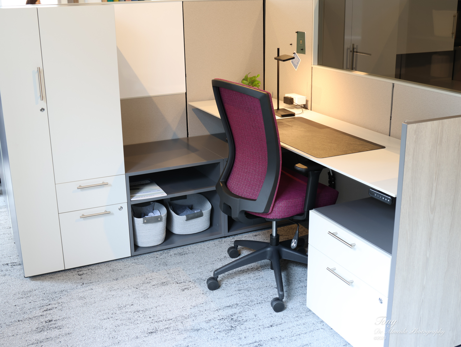 The final design featured medium-height (50”h) panels that struck the balance between collaboration and privacy. Each workstation was outfitted with an electric sit/stand L-shaped desk, allowing both worksurfaces to move together. That extra flexibility made it easier for employees to adapt and stay comfortable throughout the day.
