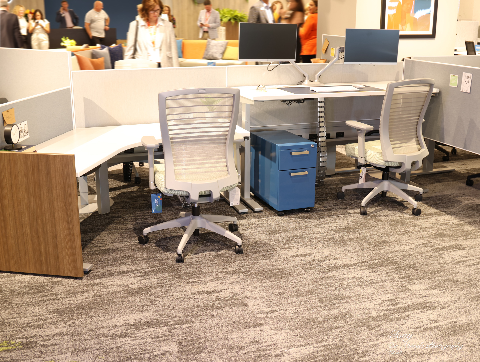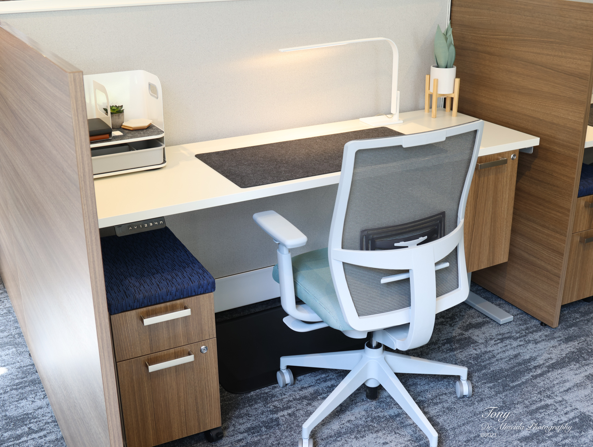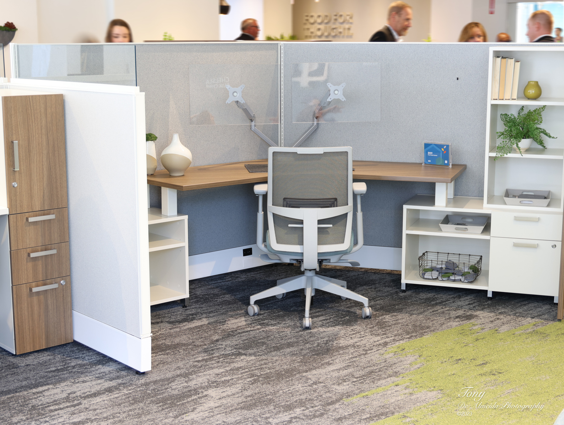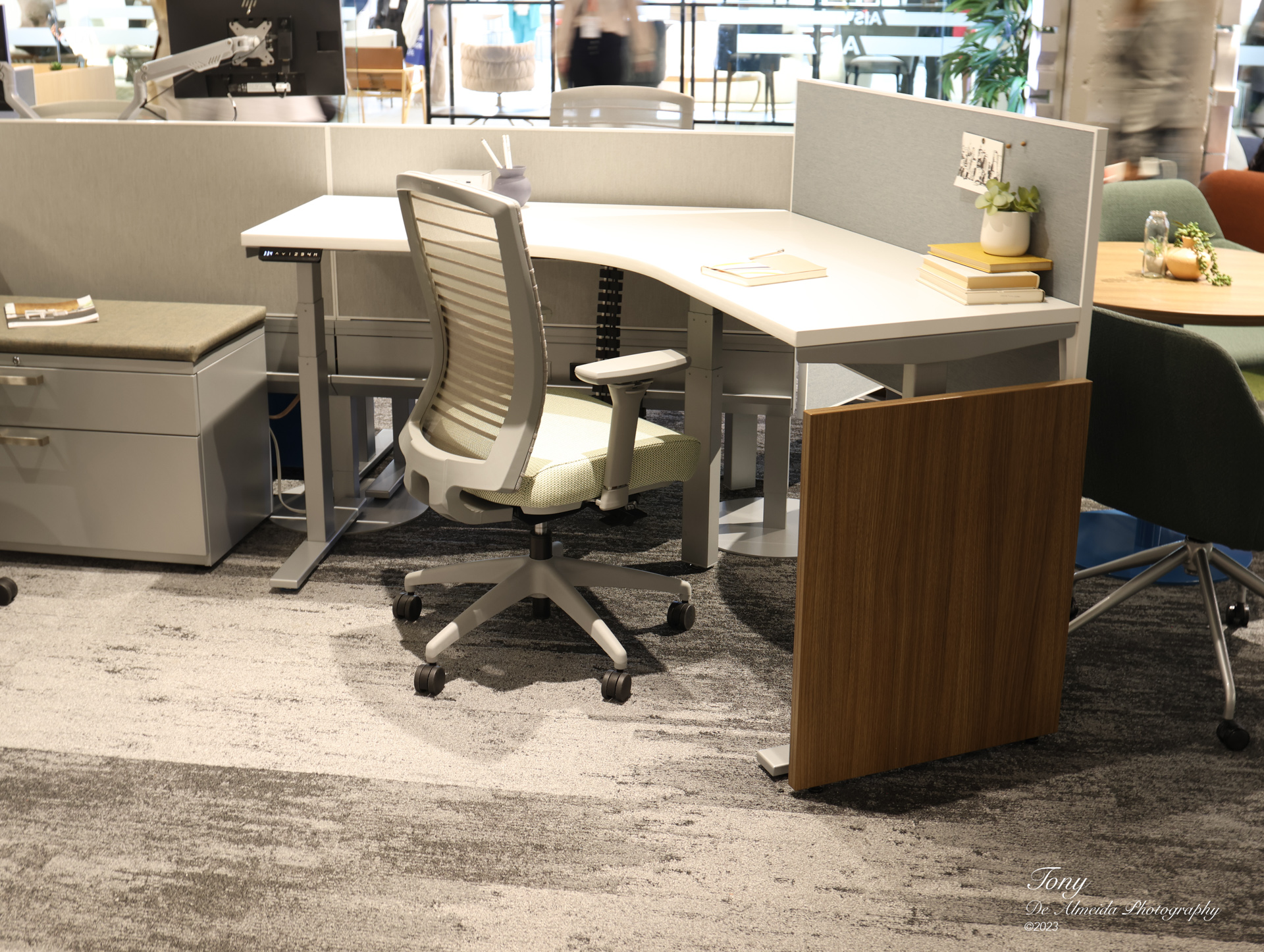 - Sit/Stand Flexibility with Height Adjustable Tables (HATs): Height-adjustable tables are no longer just a novelty; they’re here to stay. Available in two main configurations—two-leg and three-leg bases—these sit/stand tables accommodate various work styles. The two-leg base supports a single surface, while the three-leg option supports an L-shaped configuration, allowing the entire worksurface to be raised or lowered. Whenever possible, I encourage clients to select the three-leg base because it offers greater flexibility, and clients love the versatility it provides!