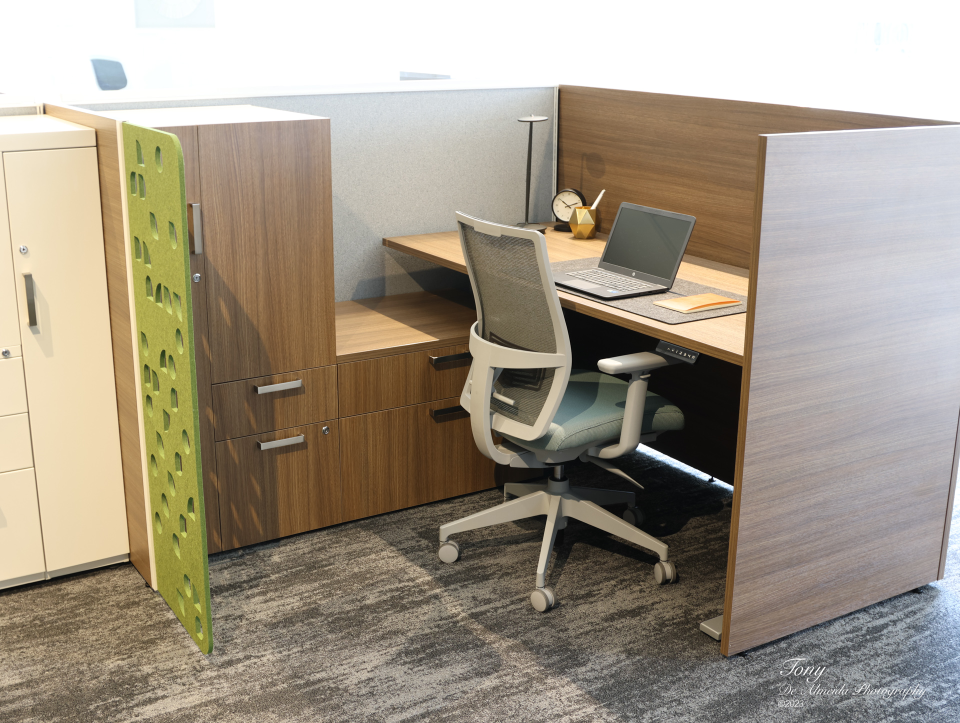 - Revolution in Personal Storage: Traditional workstations once relied on basic storage solutions: file cabinets beneath the desk and perhaps a flip-door bin above. Now, personal storage options have expanded, with mobile box/file pedestals, multi-drawer configurations, and the increasingly popular storage towers with wardrobes. Storage solutions used to be mostly metal, but laminate storage units are growing in popularity. Woodgrain laminate adds a natural wood look, and when paired with a gallery panel, it creates a truly beautiful and cohesive design. I’m a big fan of the storage tower with a wardrobe—it’s a more efficient use of space, often eliminating the need for overhead bins and tall panels. This allows for medium-height panels (around 50 inches), which bring in more natural light and outdoor views, compared to the taller 62-inch panels that can create uneven sight lines.